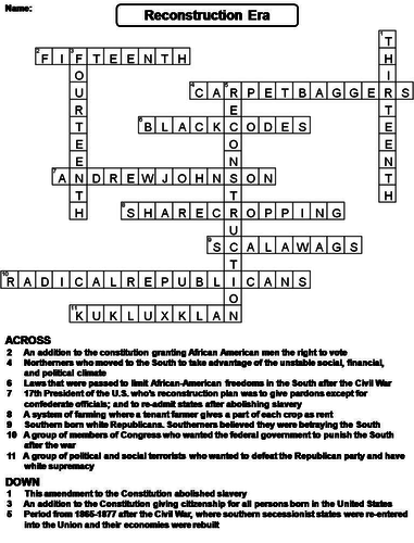 This crossword puzzle on the reconstruction era is a fun vocabulary review for students and contains the following. In fact there are so many free crossword puzzles that they can make your head spin. Separation of people based on race 10.